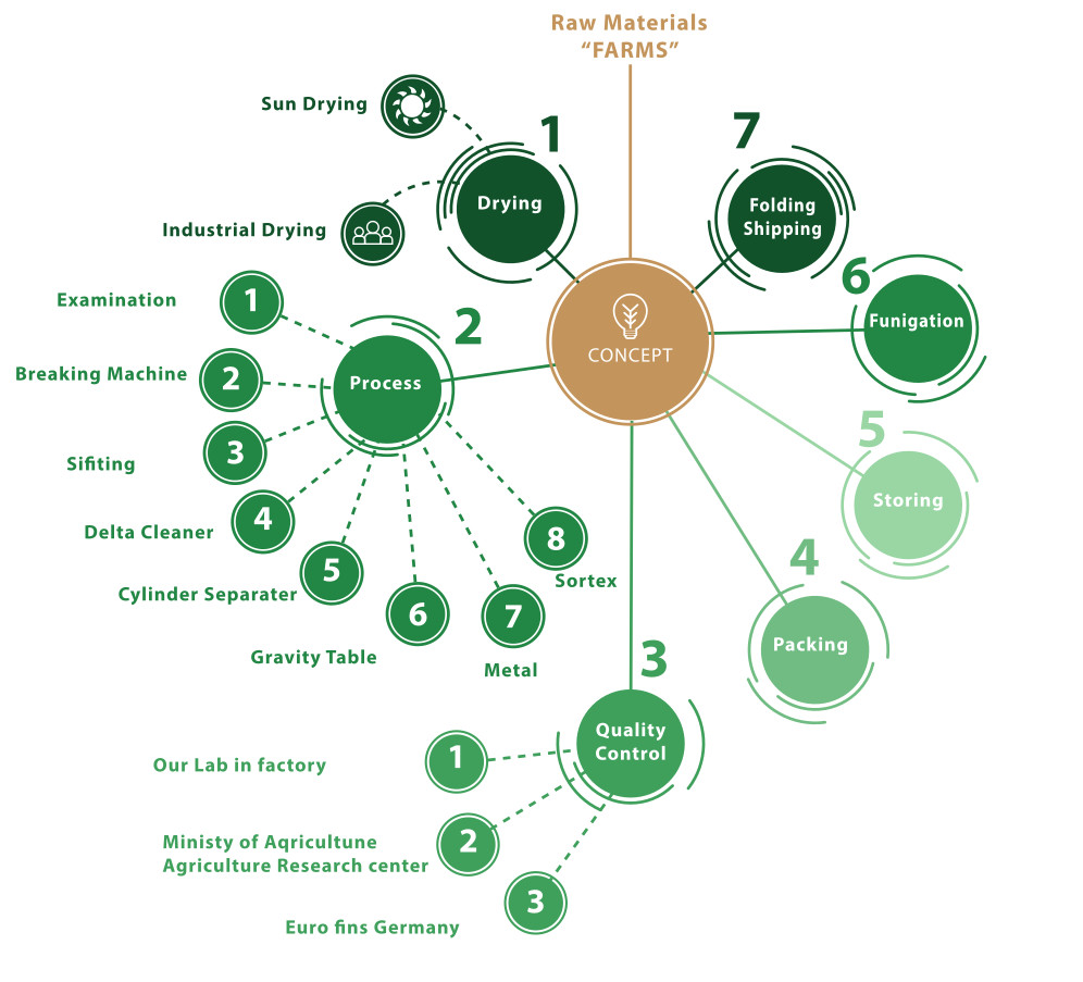 The processing begins from raw material which comes from farms and it has been dried. After that the product passes into breaking machine, Vibrators to get rid of dust and large stems, Delta screen to ensure excellent efficiency and purity, Cylinder Separator used for grading by length of all granular materials and for separating undesired long or short product impurities, Gravity separator used for the separation of any kind of kernels and granular products, Metal detector to separate any type of metals, Sortex to separate colors especially in seeds and granules. Then it has been packed, stored and followed by Fumigation. Finally products are loaded and shipped.